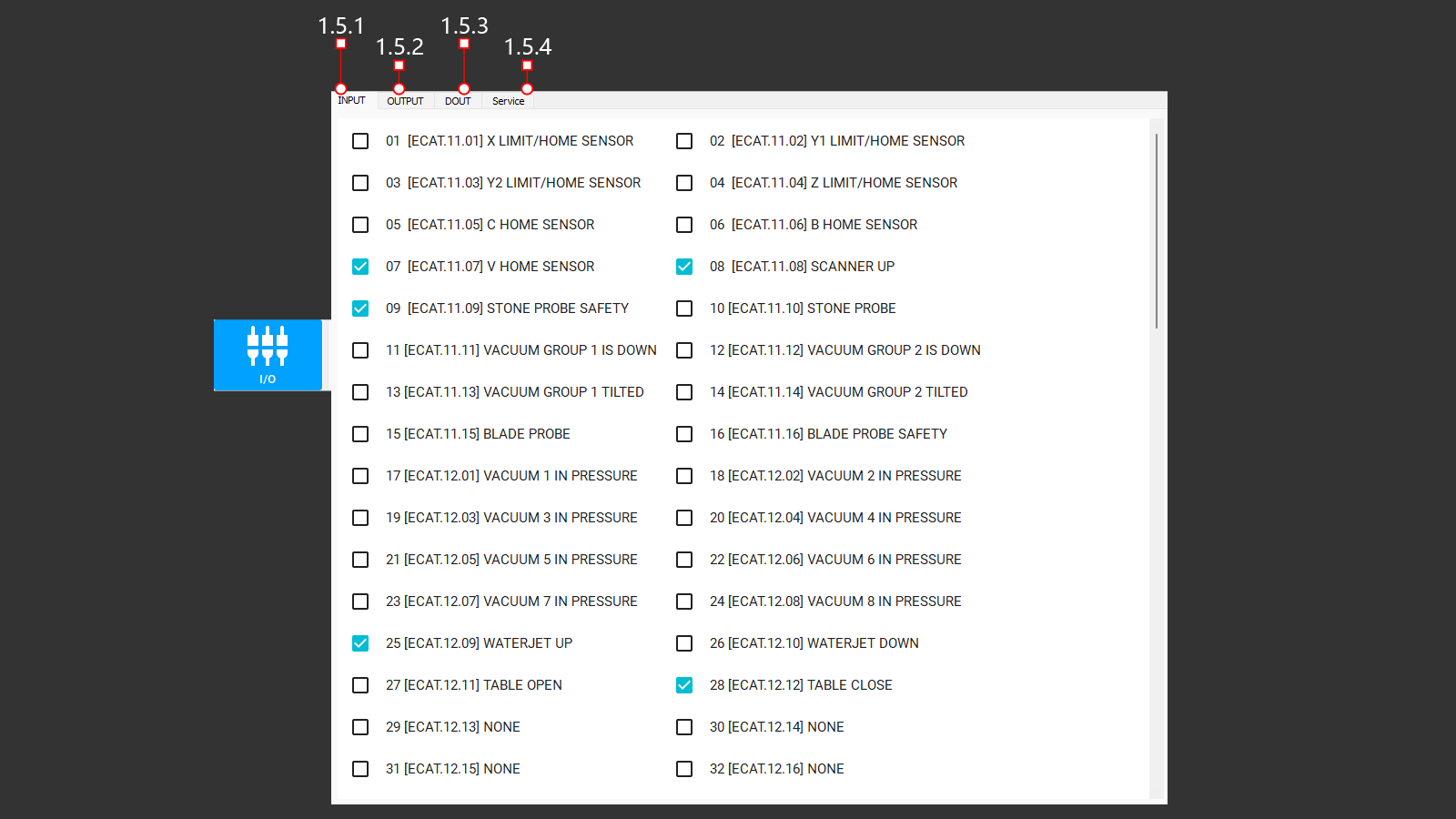 A tab with the output signals from the main modules and components of the machine. The operator can use this tab to check the operation of selected commands, see how the machine is performing, and, if necessary, make adjustments.