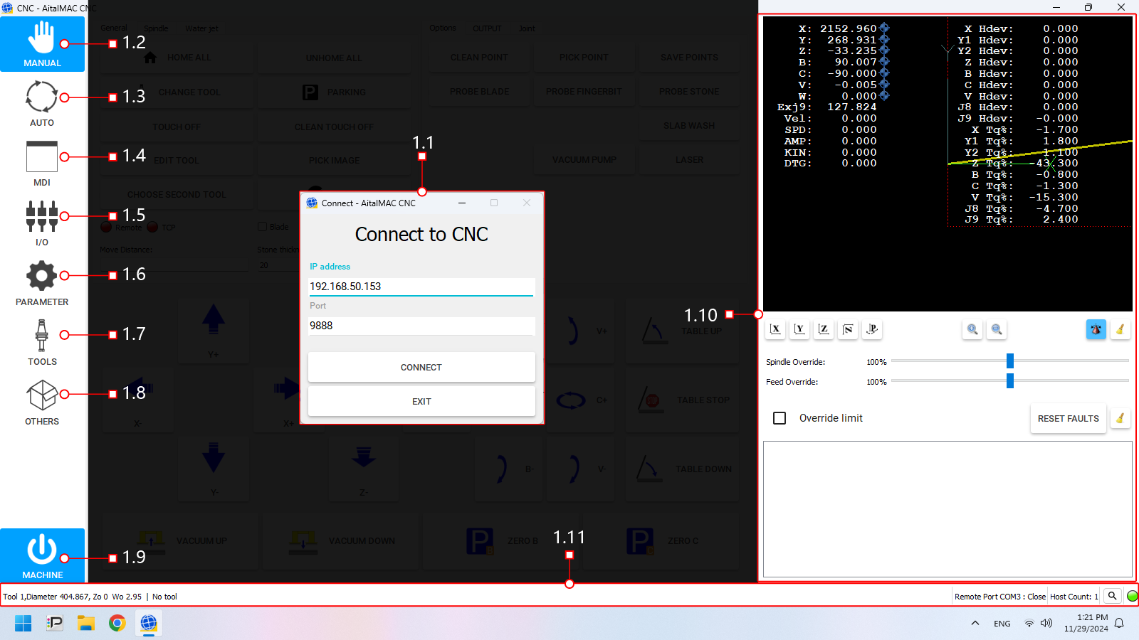- Connection Status: Enables users to connect to the CNC controller.