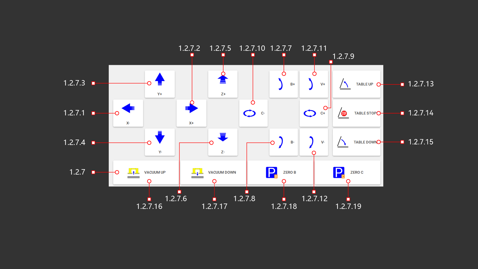 This button moves the machine to a designated parking position as defined in the parameters. Parking is not always safe, particularly when the machine is engaged with the material, such as during a 45-degree miter cut. Always ensure the machine is in a safe state before initiating the parking operation.